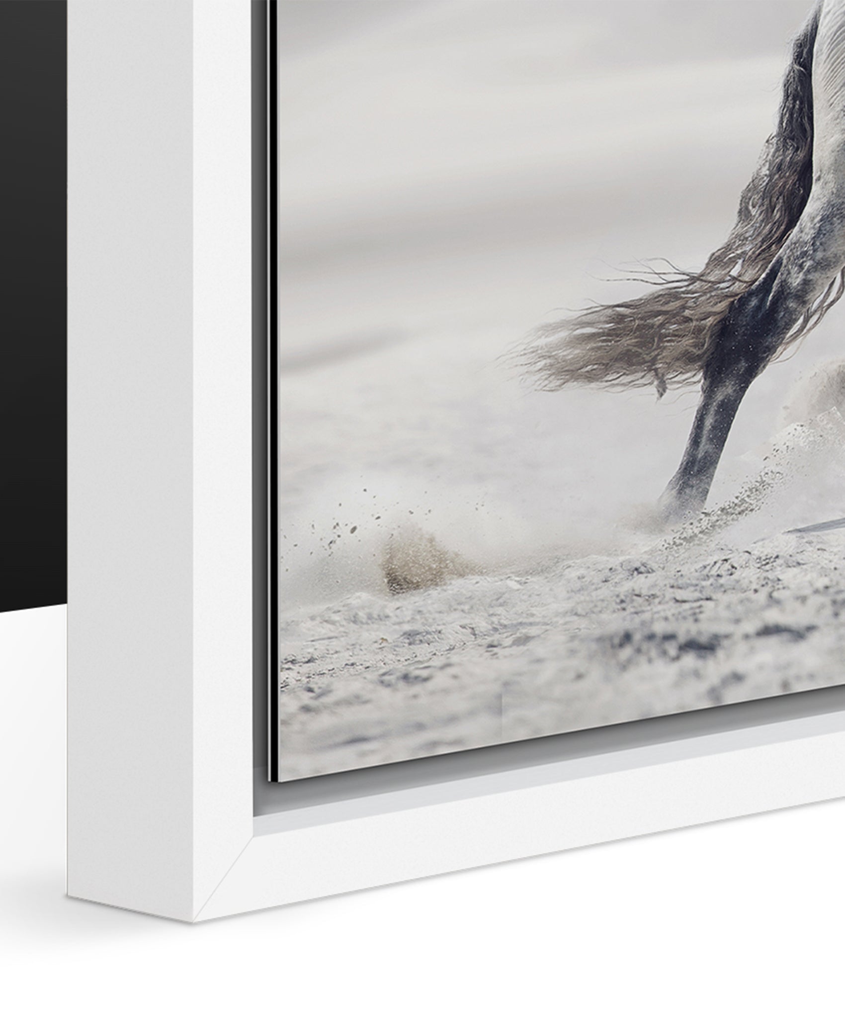 Each artwork is custom framed within a .59" hardwood floater frame. A small gap between the frame and the edges of the glass makes the artwork appear to float inside the frame. Available in white, black and brown matte finishes.
